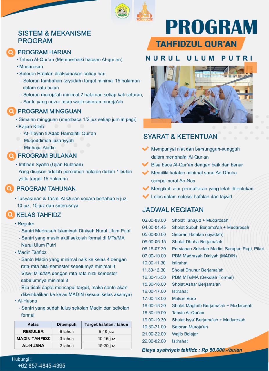 PROGRAM TAHFIDZUL QUR’AN adalah salah satu program unggulan khusus yang ada di Pondok Pesantren Nurul Ulum yang memiliki kelas sekitar 60 santri terdiri dari kelas Reguler, Madin Tahfidz dan Al Husna. Adapun beberapa program dan ketentuannya sebagai berikut;